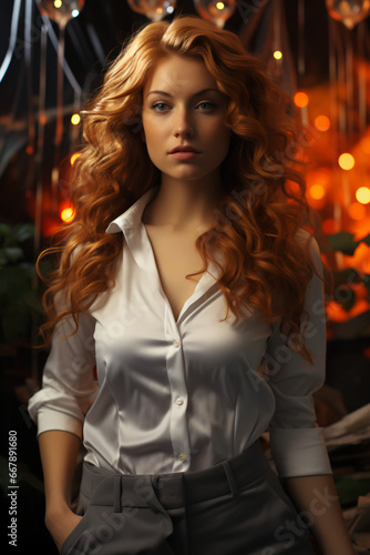 Distant view of the most beautiful business woman, 30 years old, beauty, proud, long curly orange hair, thin legs, a plunging big décollecté in a open white shirt