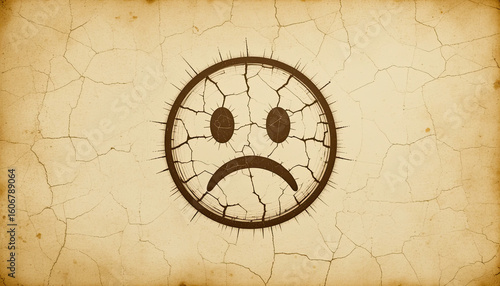 Distressed antique sad face with cracks evokes sorrow, depression, and emotional pain, ideal for mental health awareness campaigns and poignant illustrations of grief