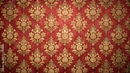 Distressed red vintage wallpaper with a floral pattern and gold accents, decor, design, decor, design, distressed, vintage