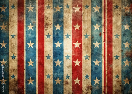 Distressed vintage grunge textured patriotic background with worn red white and blue stripes, faded stars, and subtle texture, featuring empty copy space for design.