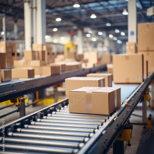 Distribution center with boxes, conveyor belt with boxes for delivery in an automated warehouse.