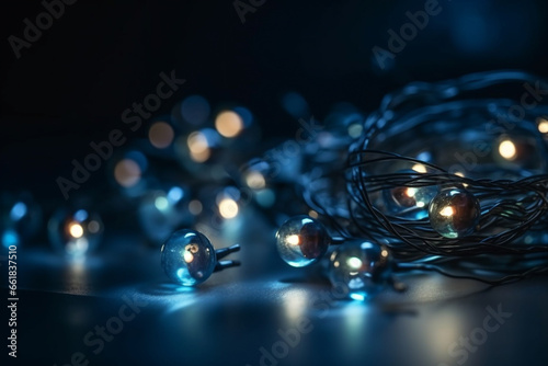 Dive into the festive spirit with a macro view of creatively designed blue holiday lights and decorations. Ai generated