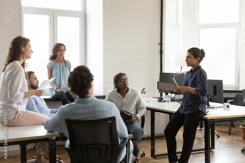 Diverse business group of serious employees negotiating on work project in office, sharing ideas for startup, listening to Indian female business leader. Company coach training interns