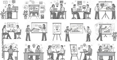 Diverse business people collaborate and present ideas in office settings