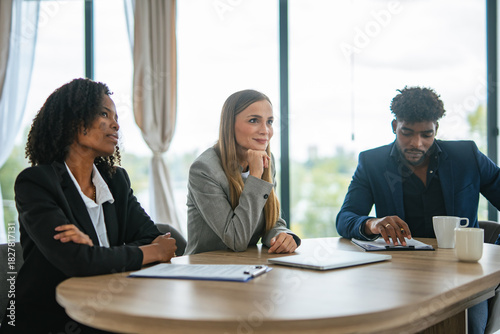 business, meeting, discussion, corporate, professional, teamwork, diversity, office, colleague, collaboration, strategy, planning, people, work, consulting, brainstorming, conference, executive, leadership, manager, employee, serious, attentive, concentration, indoor, modern, workplace, formal, success, management, career, job, group, adult, sitting, table, document, laptop, african american, caucasian, multicultural