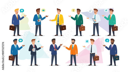 Diverse business professionals presenting ideas and solutions in a vector illustration