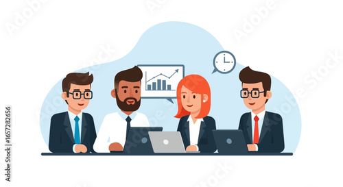 Diverse business team collaborating in a professional setting, analyzing data, and strategizing for growth and success. Ideal for corporate, finance, and office themes.