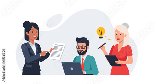 business, teamwork, collaboration, meeting, brainstorming, idea, project, team, colleague, office, presentation, laptop, document, woman, man, diverse, multicultural, professional, success, strategy, planning, discussion, communication, innovation, creativity, work, workplace, corporate, modern, illustration, vector, graphic, design, people, businessman, icon, cartoon, symbol, person, avatar, suit, man, businesswoman, computer, face, attaching, concept