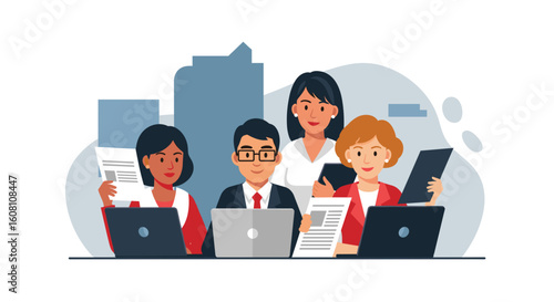 collaboration, teamwork, colleague, co-worker, office, laptop, computer, document, professional, meeting, group, project, success, technology, modern, illustration, vector, design, graphic, corporate, strategy, planning, work, people, employee, businessperson, woman, man