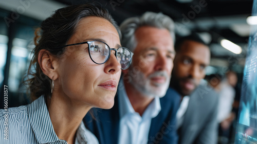 Diverse business team in a modern glass office, mixed genders and ethnicities, working with futuristic holographic interface, teamwork and innovation concept, professional corporate style
