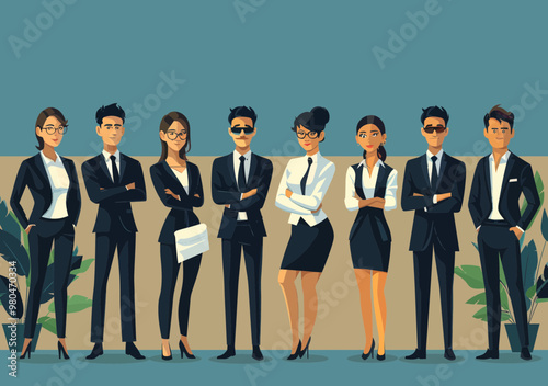 Diverse Business Team Standing Confidently in Professional Attire, Minimalistic Vector Illustration for Corporate and Office Themes