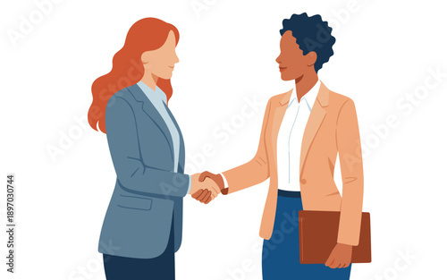 Diverse businesswomen shaking hands in agreement illustration professional partnership deal for corporate success multicultural team collaboration in modern office environment contract negotiation for
