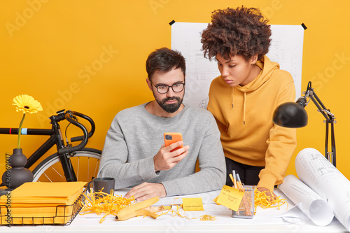 Diverse busy woman and man work together in office concentrated at smartphone learn information from website have attentive expressions check email develop new strategy for engineering project