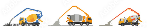 Diverse cement mixer trucks with extended booms pouring fresh concrete solutions