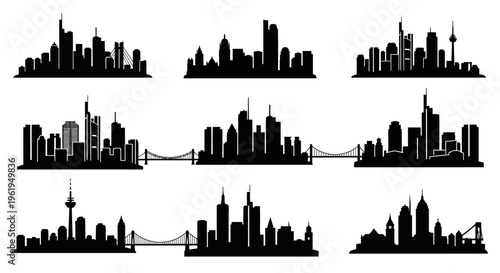 Diverse City Skylines Silhouettes: Modern Architecture, Bridges, and Towers