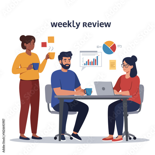meeting, business, team, work, office, collaboration, discussion, strategy, planning, analysis, datum, chart, graph, report, presentation, hot drink, break, people, diverse, colleague, employee, professional, corporate, company, success, growth, progress, performance, review, weekly, brainstorming, idea, communication, teamwork, together, synergy, startup, management, finance, marketing, project, workspace, modern, interior, illustration, vector