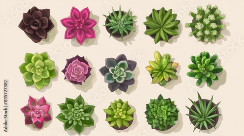 Diverse collection of colorful succulents arranged in a flat lay display showcasing unique textures and shapes for gardening enthusiasts