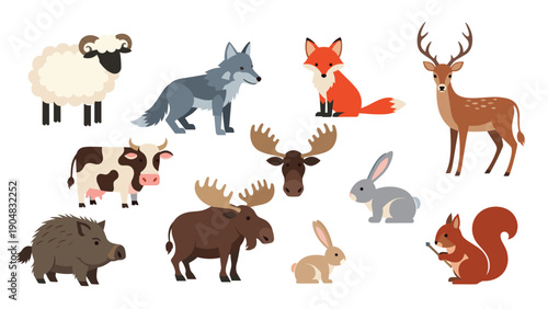 forest, animal, wildlife, collection, set, sheep, wolf, fox, cervid, cow, moose, rabbit, wild boar, squirrel, acorn, nature, wood, illustration, vector, art, design, graphic, mammal, fauna, colourful, friendly, forest floor, habitat, environment, antler, horn, fur, tail, ear, snout, tusk, hoof, timberland, group, diverse, children, children