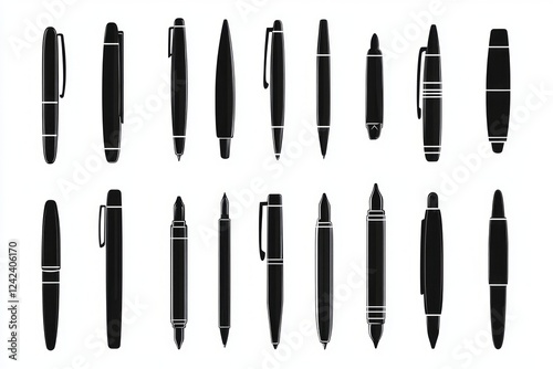 ball pen, writing, office, design, pen, modern, vector, black, various, graphic, type, fountain, illustration, marker, stylus, drawing, style, art, paper, different, ink, silhouette, simple, stationery, collection, shape