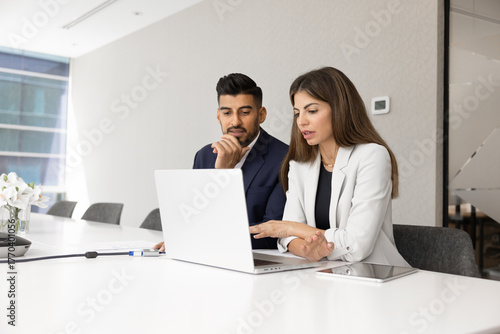 2, latin, hispanic, indian, diverse, people, woman, female, male, man, young, business, employee, men at work, professional, manager, co-worker, colleague, teamwork, businessman, businesswoman, office, work, corporate, workplace, table, sitting, startup, laptop, computer, online, cyberspace, meeting, project, talk, negotiate, speak, tied-up, technology, communication, modern, contraption, device, together, serious, candid, product
