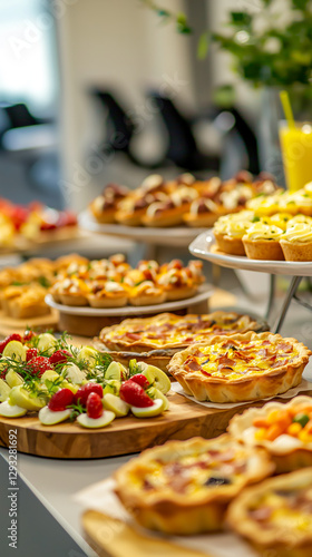 Diverse display of mini quiches, tarts, and fruit platters at a catered event, featuring various flavors and fresh ingredients.