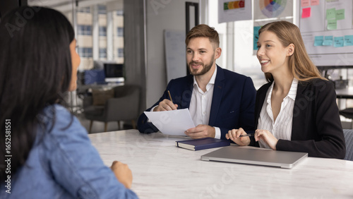diverse, caucasian, people, man, male, woman, female, young, girl, adult, business, employee, men at work, professional, manager, leader, boss, businessman, businesswoman, candidate, applicant, employer, hr, recruiter, recruit, agent, office, work, workplace, table, talk, meeting, hiring, human, resource, interview, job, modern, teamwork, partnership, contract, agreements, cv, banner, header, happy, smile, positive, friendly