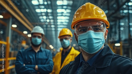 factory, men at work, businessman, engineer, safety, teamwork, industry, production, collaboration, hard hat, mask, indoor, machinery, labor, manpower, occupation, engineering, management, facility, manufacturing, people, professional, role, environment, task, process, equipment, quality, safety-gear, assembly, training, expertise, skill, planning, support, organisation, structure, assembly line, communication, leader, workplace, design, innovation, motivation
