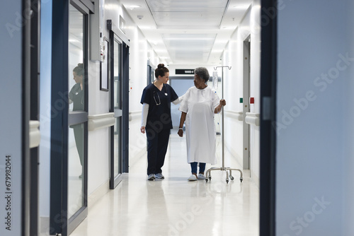 Diverse female doctor talking with senior female patient with drip in hospital corridor