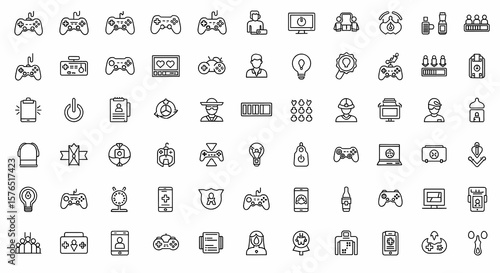 icon, outline, gaming, technology, controller, user, monitor, group, bottle, battery, smartphone, power, document, reusing, hat, loading, heart, helmet, laptop, box, light bulb, award, camera, shield, phone, beer, screen, people, team, medicals, scissors, white, vector, illustration, symbol, design, graphic, element, modern, simple, clean, flat, style, collection, set, signs, interface, web