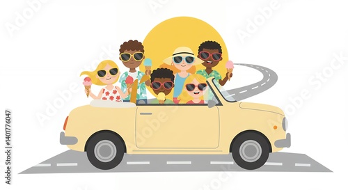 people, group, diverse, summer, car, cabrio, yellow, cartoon, ice cream, happy, fun, summer, children, family, friends, vacation, travel, poster, advertising, illustration, vector, clip art, children, holiday, entertainment, social, promotion, design