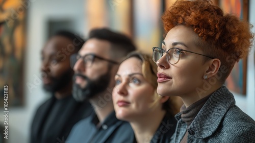 appreciation, contemplation, diverse, diversity, group, multiracial, painting, engagement, art gallery, people, indoor, attentive, thoughtful, focused, light, goggles, modern, facial expression, exhibition, observation, detail, curly hair, casual clothes, businesswoman, business, woman, businessman, team