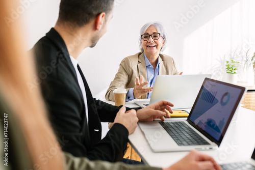 business, people, teamwork, meeting, group, office, corporate, conference, planning, work, woman, senior, discussion, communication, strategy, brainstorming, meet, man, young, adult, cooperation, businesswoman, businessman, technology, working, together, table, desk, online, tech, laptop, computer, cyberspace, cyberspace, colleague, smile, conversation, mature, company, diverse, sitting, room, interior, successful, entrepreneur, idea
