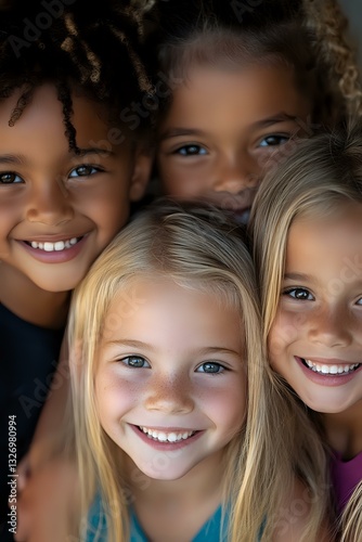 children, friendship, diversity, smiling, happiness, childhood, multicultural, togetherness, joy, innocence, portrait, closeup, education, school, youth, cheerful, genuine, natural light, facial expression, blue eye, blonde hair, curly hair, african american, caucasian, authentic, connection, community, inclusion, oneness, elementary school, learning, development, confidence, optimism, future, hope, social skills, bonding