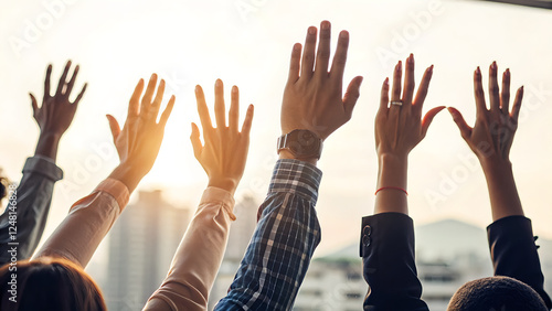 hand, sunset, sky, diversity, oneness, teamwork, support, celebration, gratitude, success, hope, joy, community, excitement, connection, encouragement, friendship, motivation, inspiration, communication, business, cooperation, engagement, people, togetherness, achievement, cultural, lifestyle, warm, light, optimism, nature, background, urban, silhouette, group, enthusiasm, upward, positive, event, happiness, social, uplift, movement, human