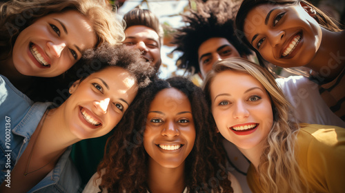 Diverse group of happy friends taking a selfie together, smiling at the camera, close-up.