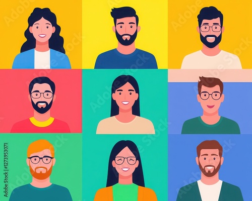 Diverse group of illustrated individuals showcasing various hairstyles and expressions on vibrant colorful backgrounds.