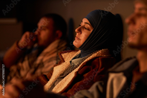Diverse group of Middle Eastern people hiding in dark bomb shelter with young woman in foreground
