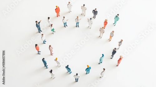 Diverse Group of Miniature People Standing in a Circular Formation on a White Background, Symbolizing Unity, Collaboration, and Community Engagement