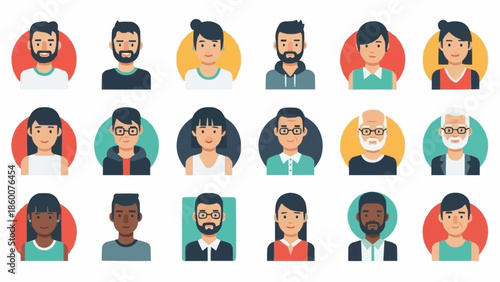 avatar, people, group, diverse, collection, illustration, flat, design, character, icon, user, profile, face, head, portrait, man, woman, male, female, young, old, age, sex, human, person, identity, representation, community, team, network, social, media, online, digital, communication, connection, business, concept, graphic, art, style, modern, simple, clean, vector, set, variety, individual, app