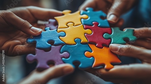 diverse group of people collaboratively holding and connecting colorful puzzle pieces symbolizing teamwork unity and collaboration in multicultural setting.illustration