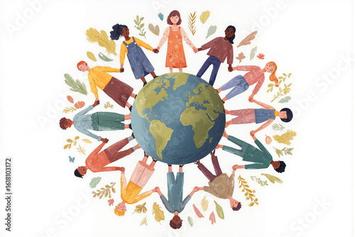 Diverse group of people holding hands around a globe surrounded by leaves and flowers in a joyful display of unity and connection