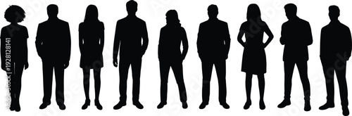 silhouette, people, group, standing, line, man, woman, diversity, individual, figure, human, crowd, collection, set, male, female, adult, children, person, black, white, background, isolated, business, professional, casual attire, clothing, pose, different, shape, size, full body, front view, half face, profile, outline, shape, form, representation