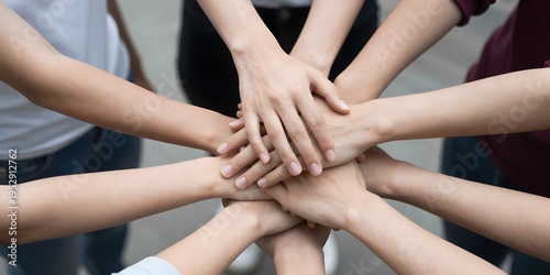 Diverse group of people stacking hands in a circle to show teamwork and solidarity