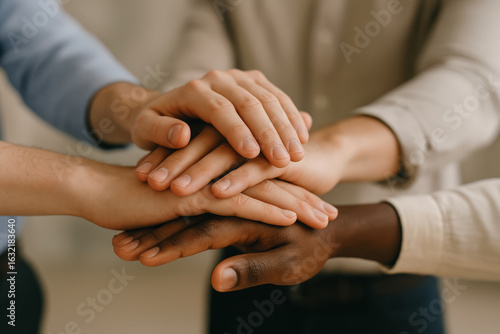 Diverse group of people stacking hands in a gesture of unity, teamwork, and mutual support