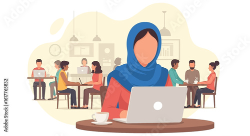cafes, cafes, laptop, computer, technology, collaboration, teamwork, diversity, multicultural, people, woman, modern, business, meeting, communication, global, cyberspace, work, freelance, lifestyle, illustration, vector, graphic, design, background