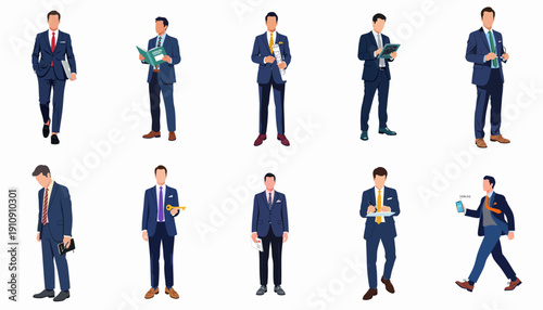 Diverse group of professional businessmen in suits illustration set, isolated on white, performing various corporate tasks with technology and documents.