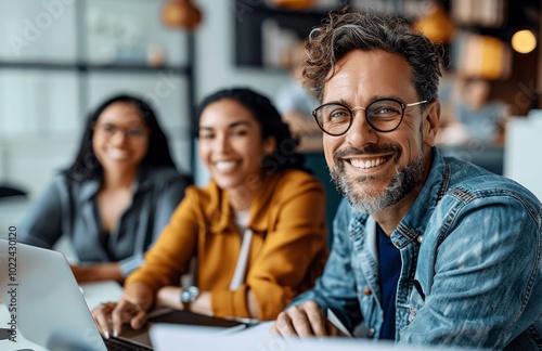meeting, business, teamwork, office, businessperson, colleague, business meeting, corporate, team, co-worker, discussion, happy, group, professional, working, workplace, together, project, smiling, laughing, people, man, woman, businessman, businesswoman, startup, casual attire, male, female, laptop, talking, photogenic, goggles, sitting, work