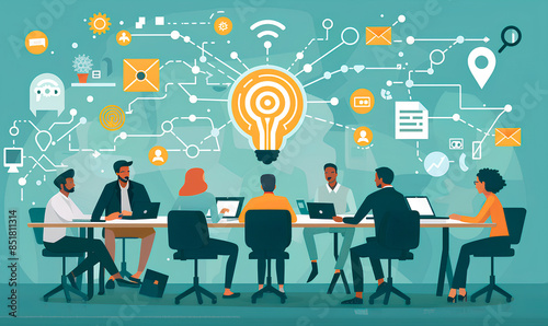 Diverse group of professionals sit around a table, brainstorming new ideas, with a large lightbulb symbolizing innovation above them