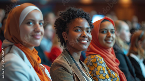 Diverse group of women attentively participating in a conference, highlighting multicultural engagement and professional networking.