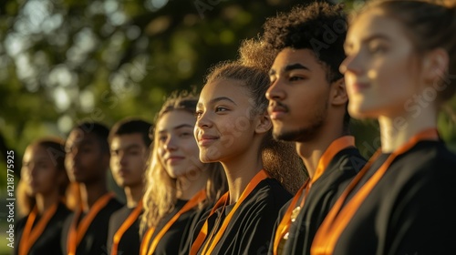 graduation, student, diversity, hope, future, optimism, youth, group, friends, together, robe, sash, orange, black, sunlight, warm, young, adult, people, female, male, achievement, accomplishment, oneness, new